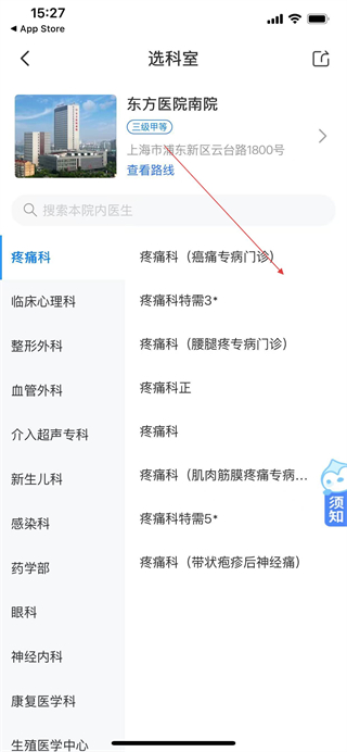 3、在選科室頁面選擇對應科室,進入該科室的門診選擇頁面。