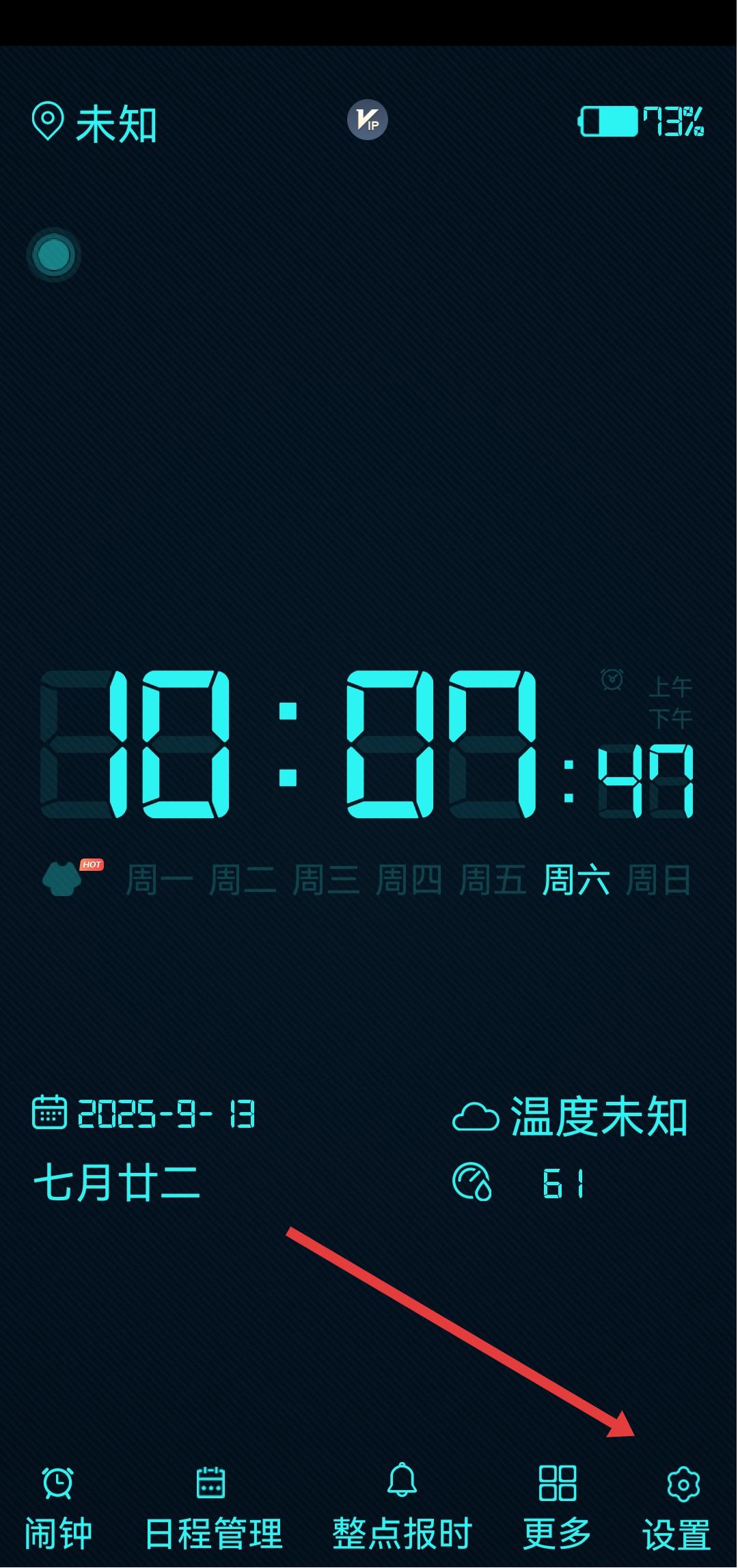 1、在冪寶桌面時(shí)鐘主界面,點(diǎn)擊底部最右側(cè)的設(shè)置選項(xiàng),進(jìn)入設(shè)置頁(yè)面。