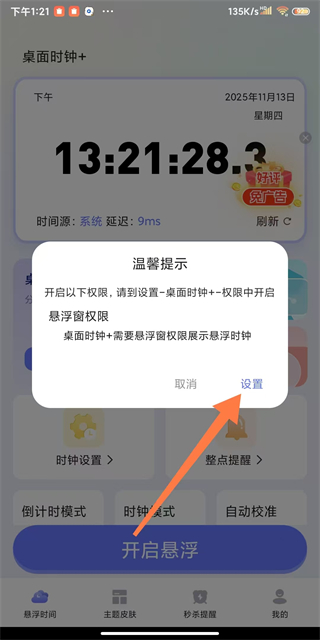 2、在溫馨提示框中,點(diǎn)擊設(shè)置選項(xiàng),進(jìn)入懸浮窗權(quán)限設(shè)置頁(yè)面。
