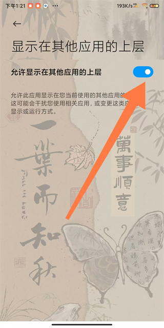 3、在懸浮窗權(quán)限設(shè)置頁(yè)面,開(kāi)啟允許顯示在其他應(yīng)用的上層功能。