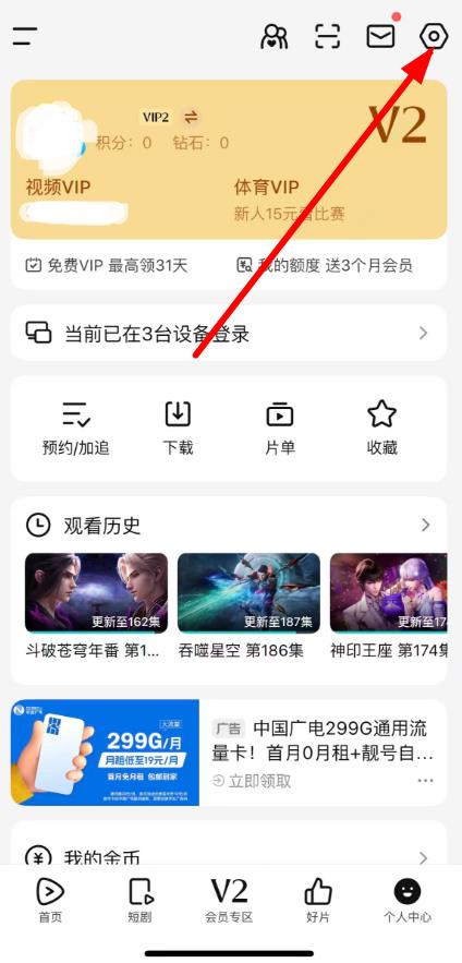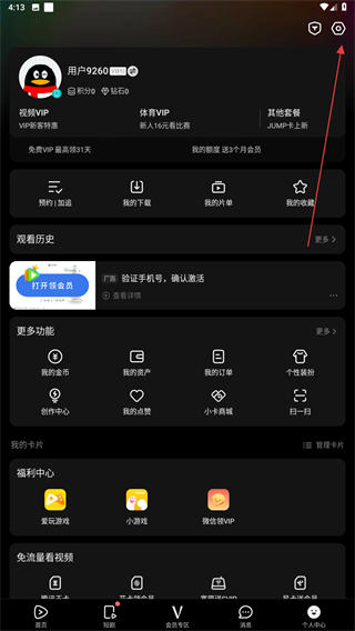 1、打開(kāi)騰訊視頻APP點(diǎn)擊個(gè)人中心進(jìn)入,點(diǎn)擊界面右上角設(shè)置圖標(biāo)進(jìn)入設(shè)置頁(yè)面。