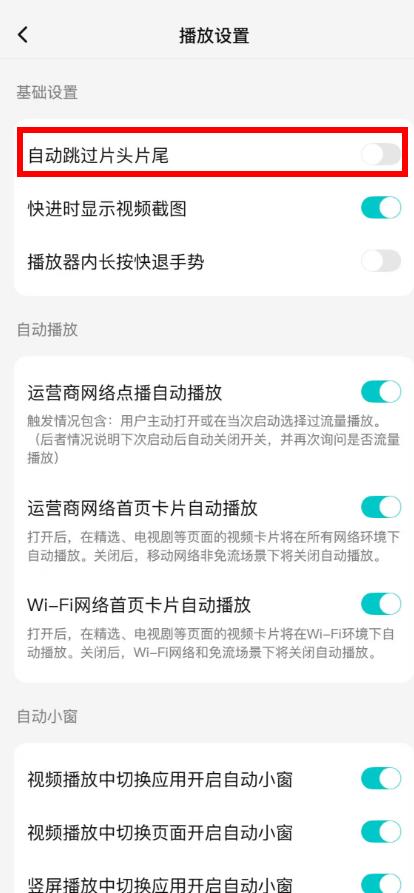 3、在播放設(shè)置界面的基礎(chǔ)設(shè)置欄下,找到自動(dòng)跳過(guò)片頭片尾選項(xiàng),點(diǎn)擊關(guān)閉右側(cè)開(kāi)關(guān)即可關(guān)閉該功能。