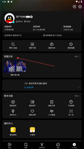 2、進(jìn)入個(gè)人中心的頁(yè)面內(nèi),點(diǎn)擊觀看歷史的按鈕。