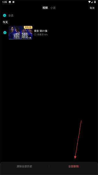 4、勾選視頻后,再點(diǎn)擊下方全部刪除的功能按鈕即可。