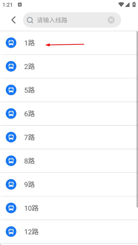 3、在公交路線選擇頁面,找到并點擊想要查詢的公交路線,比如“1路”,進入該路線詳情頁面。