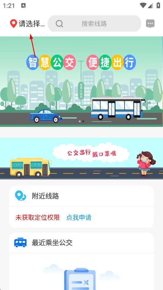 1、打開公交查詢軟件,點擊頁面左上角“請選擇...”,選擇所在城市,進入主界面。