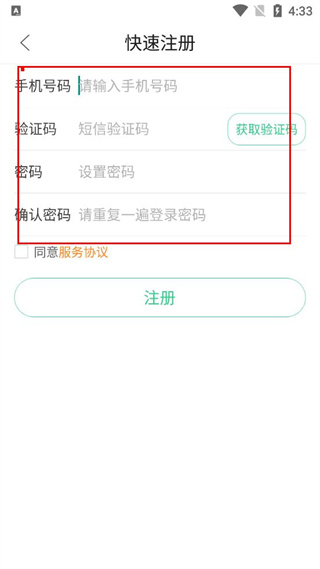 2、在快速注冊界面,依次填寫手機(jī)號碼,點(diǎn)擊獲取驗(yàn)證碼并填入,再設(shè)置密碼及確認(rèn)密碼。