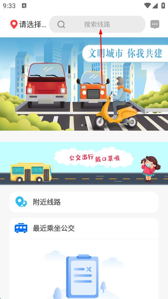 2、在應(yīng)用主界面,找到搜索線路的輸入框,點(diǎn)擊該輸入框,進(jìn)入線路搜索頁面,此時(shí)可準(zhǔn)備查詢具體公交路線。