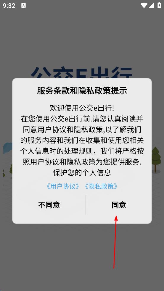 1、打開公交e出行應(yīng)用,會(huì)彈出服務(wù)條款和隱私政策提示框,認(rèn)真閱讀相關(guān)內(nèi)容后,點(diǎn)擊同意按鈕,進(jìn)入應(yīng)用主界面。