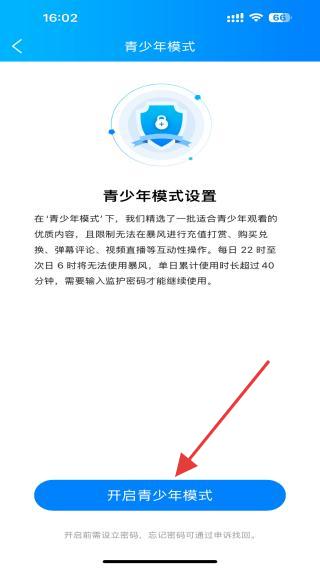 4、仔細(xì)閱讀青少年模式設(shè)置,閱讀后點(diǎn)擊開啟青少年模式即可。