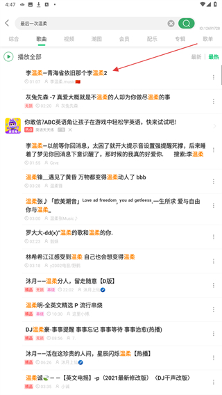 3、搜索結(jié)果出來(lái)后,找到對(duì)應(yīng)的目標(biāo)歌曲點(diǎn)擊名稱即可。