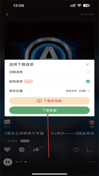 3、當(dāng)頁(yè)面彈出音質(zhì)提示后,選擇并點(diǎn)擊下載歌曲即可。