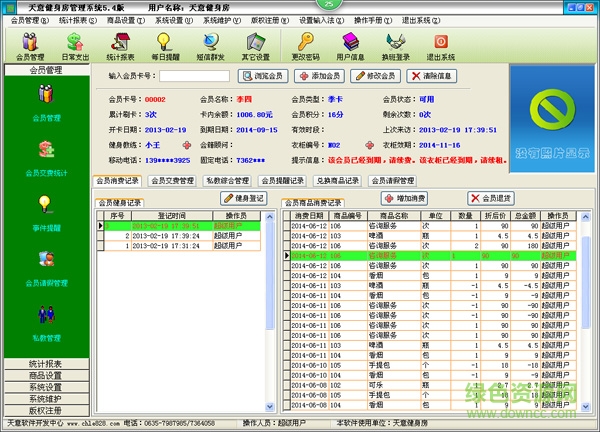 該功能可以對會員刷卡登記和會員消費店內(nèi)商品進行管理。同時也可以管理兌換商品、充值、私教。