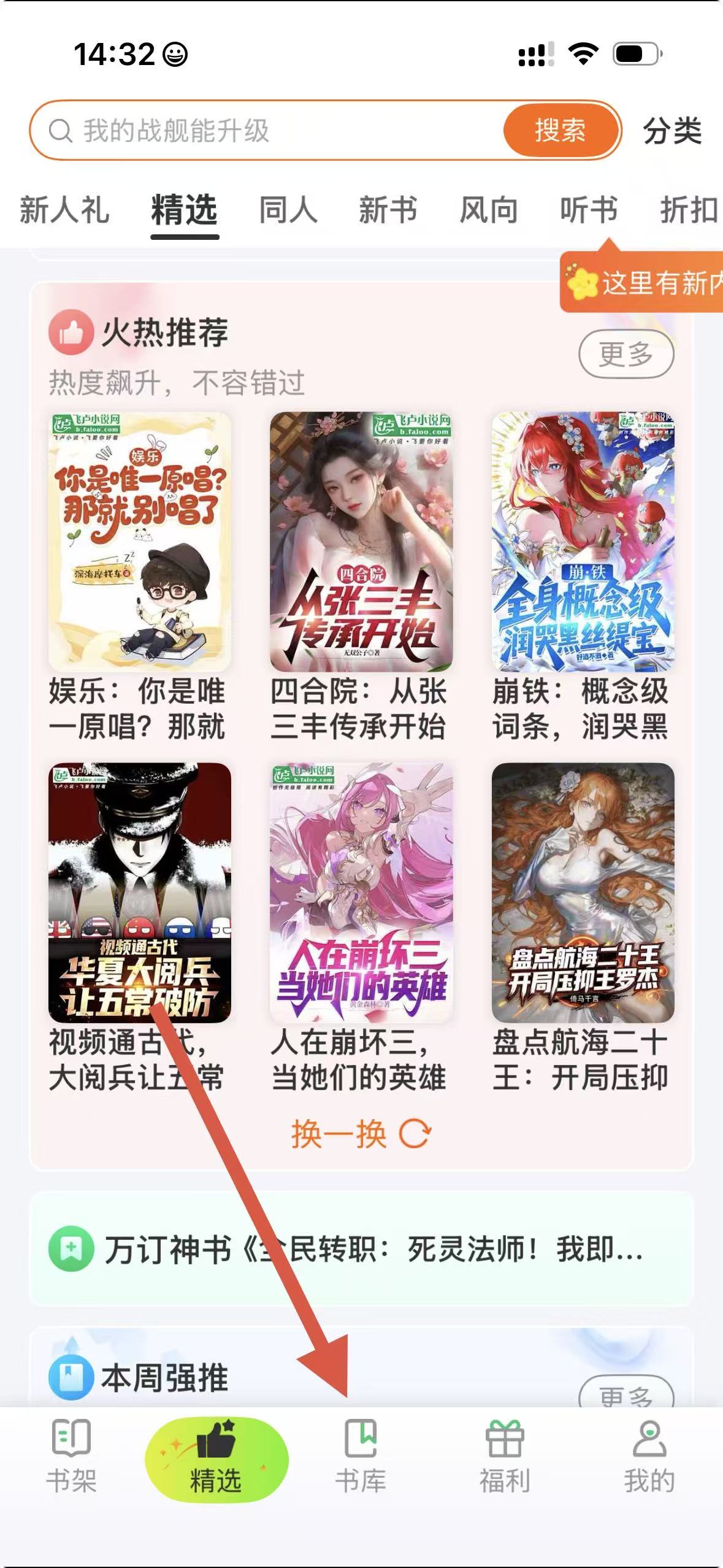 1、打開飛盧小說APP,在首頁點(diǎn)擊下方書庫選項(xiàng)。