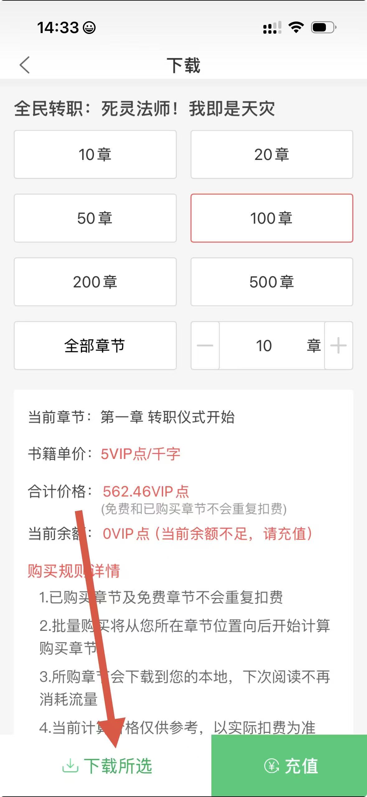 4、在下載頁面,選擇要下載的章節(jié)數(shù)量,然后點(diǎn)擊下載所選,即可將小說下載到本地。