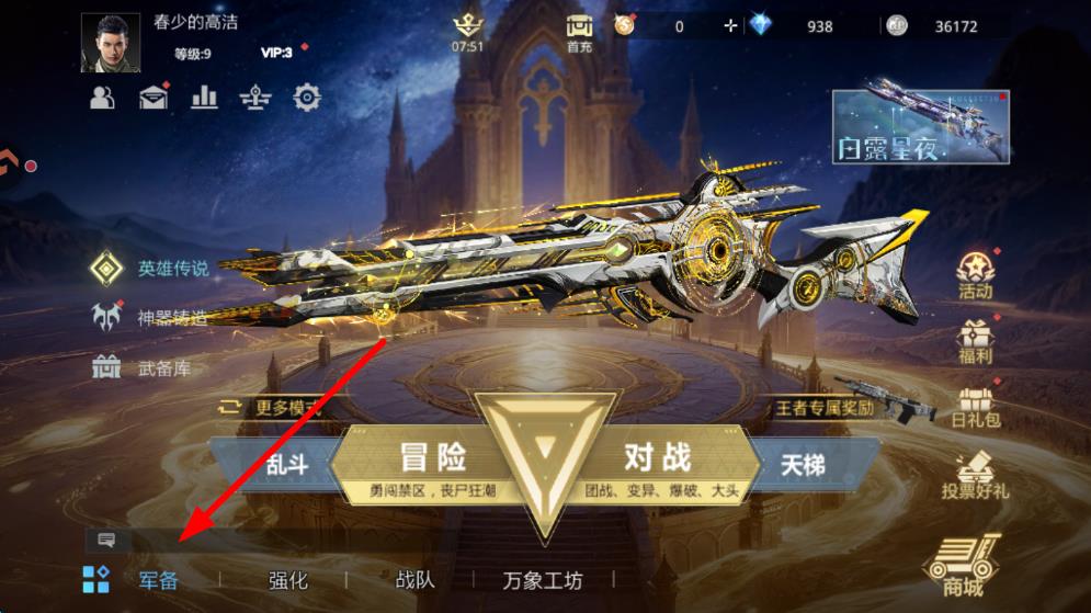 1、打開生死狙擊游戲,進(jìn)入游戲主界面,點(diǎn)擊主界面下方的軍備按鈕,進(jìn)入裝備倉庫界面。