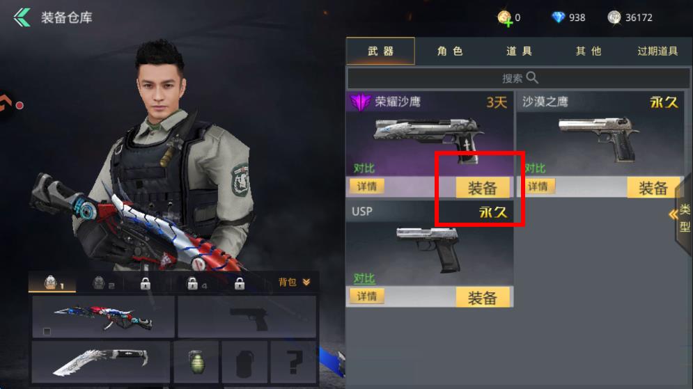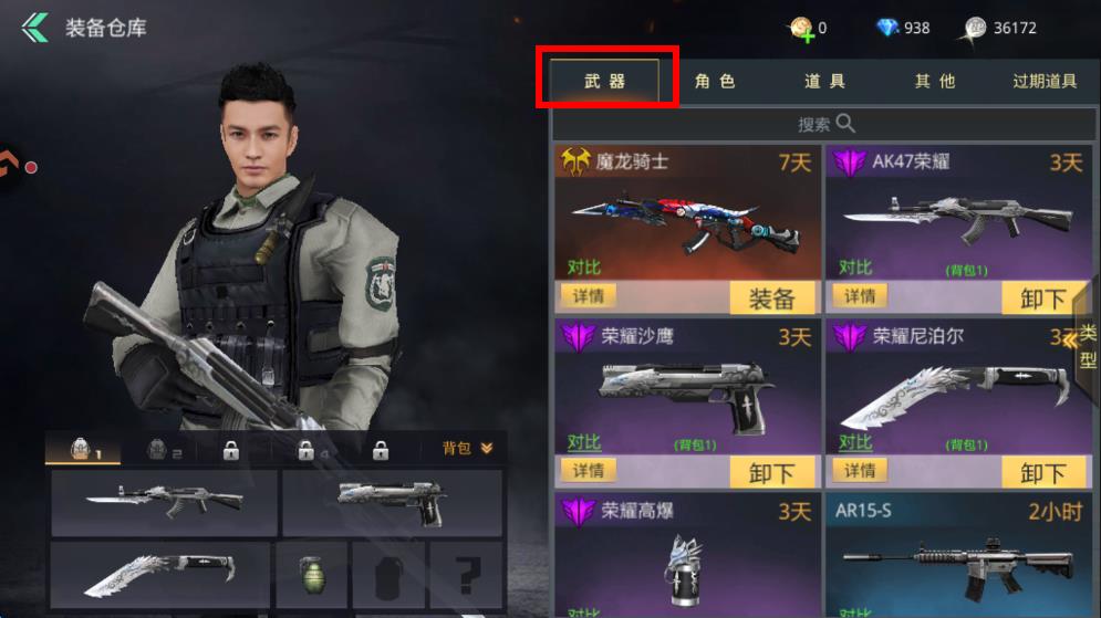 2、在裝備倉庫界面,點(diǎn)擊上方的武器選項(xiàng)卡,這里會(huì)展示你擁有的各種武器,包括主武器、副武器等。