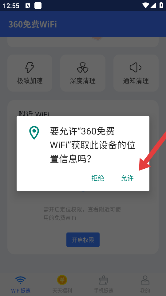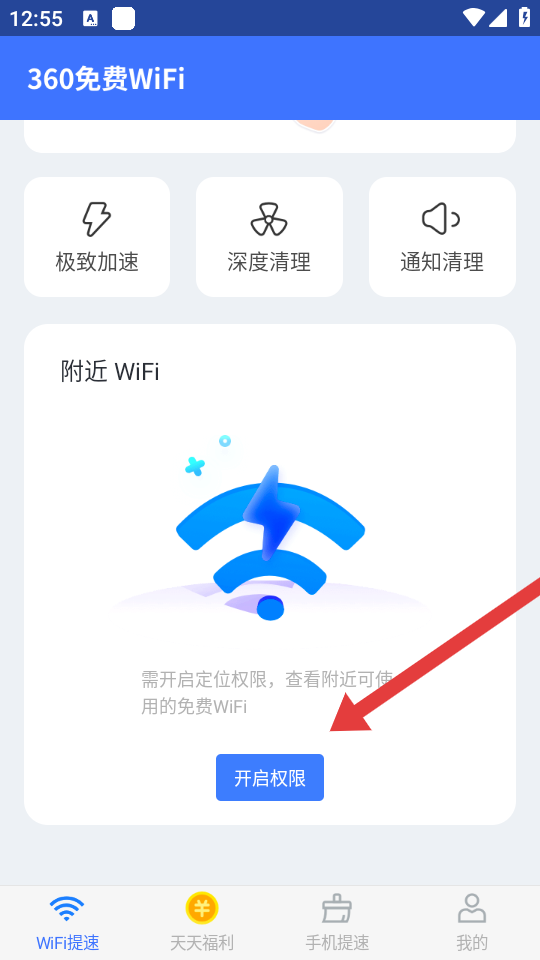 1、打開360免費(fèi)WiFi APP,在附近WiFi區(qū)域點(diǎn)擊開啟權(quán)限的按鈕,啟動附近WiFi的搜索流程。