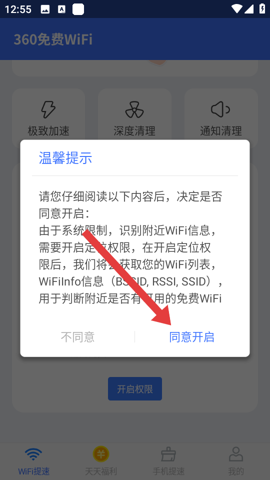 2、彈出溫馨提示彈窗時,點(diǎn)擊同意開啟,確認(rèn)開啟定位權(quán)限以識別附近的WiFi網(wǎng)絡(luò)。