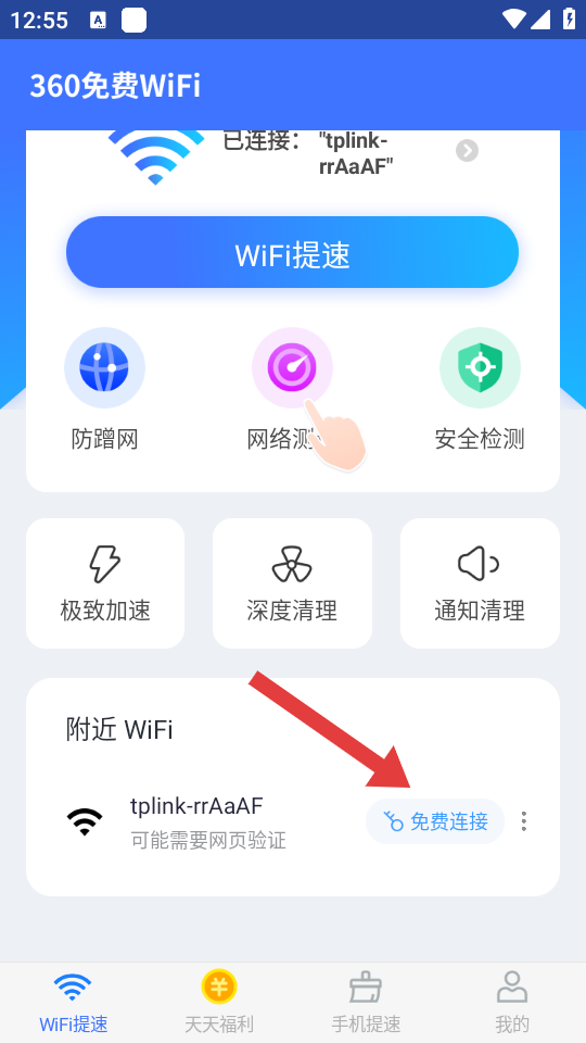 4、在附近WiFi列表中,找到需要連接的WiFi,點(diǎn)擊免費(fèi)連接按鈕,嘗試連接該WiFi網(wǎng)絡(luò)。