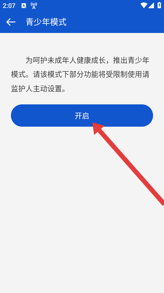 3、在青少年模式頁面,點(diǎn)擊開啟按鈕,觸發(fā)家長密碼設(shè)置彈窗。
