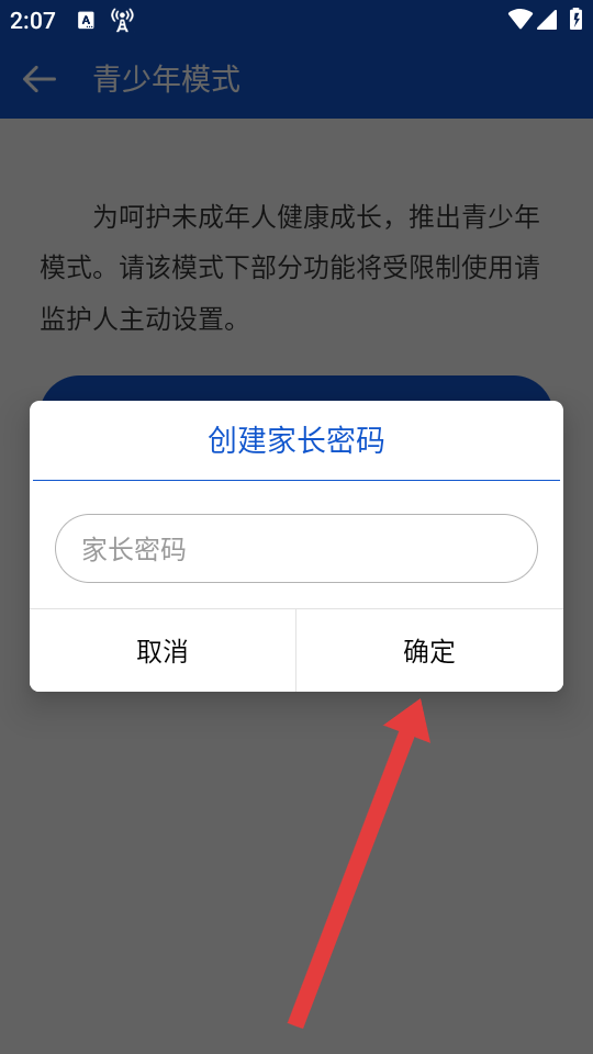 4、在創(chuàng)建家長密碼彈窗中,輸入家長密碼后點(diǎn)擊確定,完成青少年模式設(shè)置。