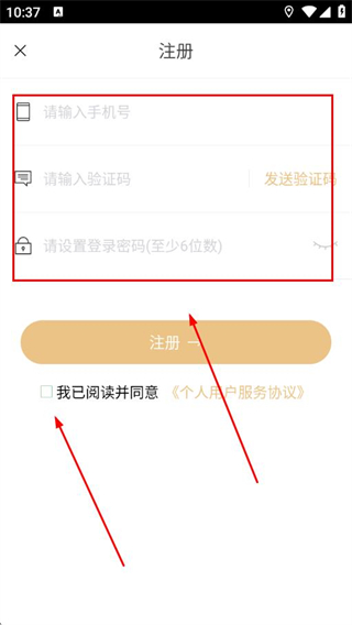 3、輸入手機號、驗證碼,設(shè)置密碼,勾選協(xié)議后,點擊注冊。