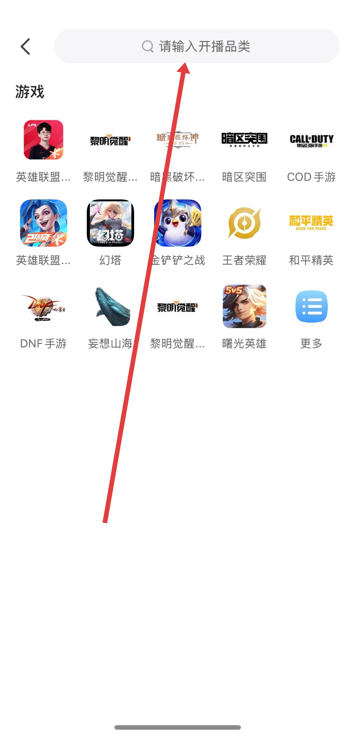 2、進(jìn)入選擇開(kāi)播品類的頁(yè)面后,在搜索欄輸入想要直播的游戲名稱進(jìn)行搜索,或者直接在下方展示的游戲列表中找到想直播的游戲,如DNF手游。