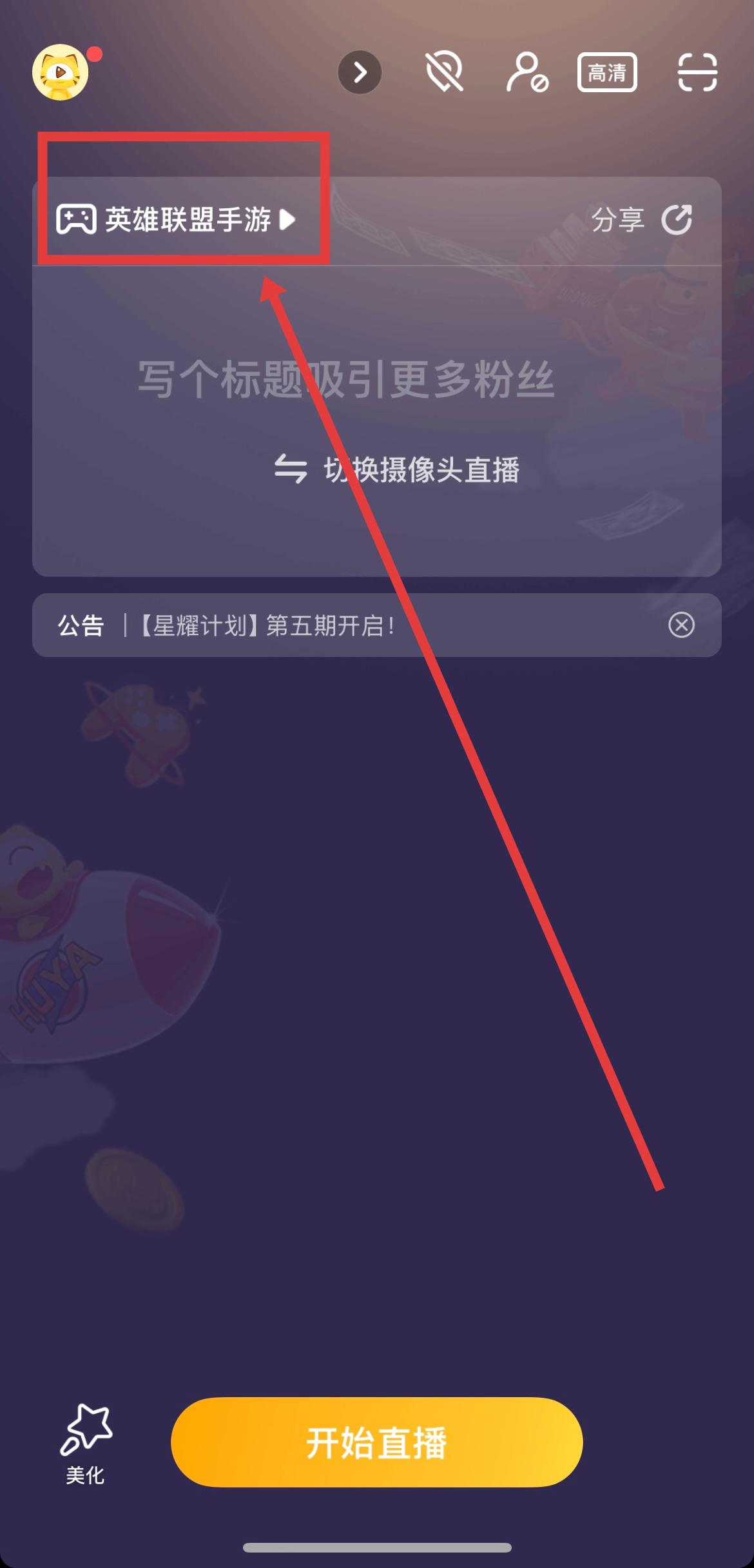 1、打開(kāi)虎牙手游APP,進(jìn)入直播界面,點(diǎn)擊界面中游戲名稱的區(qū)域,選擇你想要直播的游戲。