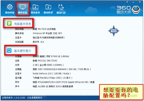 “硬件信息”,現(xiàn)在的驅(qū)動也基本實現(xiàn)了這個功能,但是本人覺得360驅(qū)動大師的硬件信息顯示的很清晰,如果你對你電腦的硬件設(shè)備不是很了解的話,可以用360驅(qū)動大師檢測下。