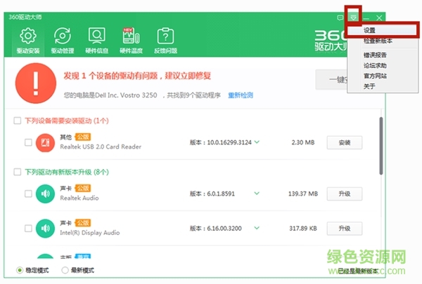 1.點擊360驅(qū)動大師右上角小箭頭,在下拉菜單中點擊【設(shè)置】;