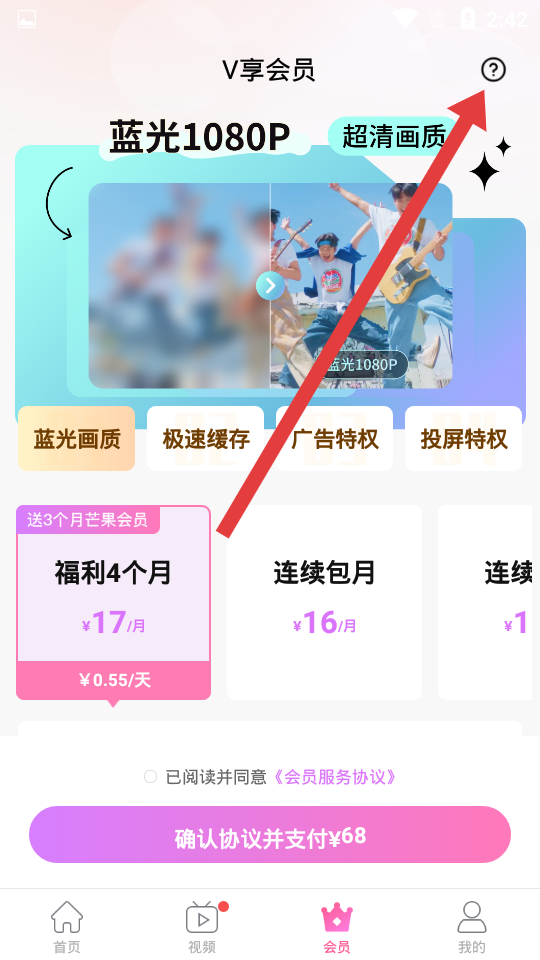 1、打開韓劇TV,點(diǎn)擊底部會(huì)員進(jìn)入V享會(huì)員頁面,再點(diǎn)擊右上角圓形問號(hào)圖標(biāo)。