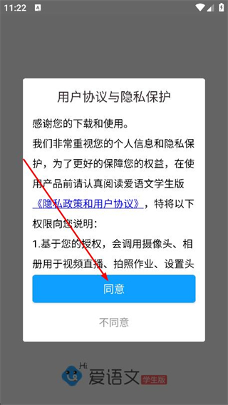 1、打開愛語文學(xué)生版app,在彈出的提示框中點(diǎn)擊同意。