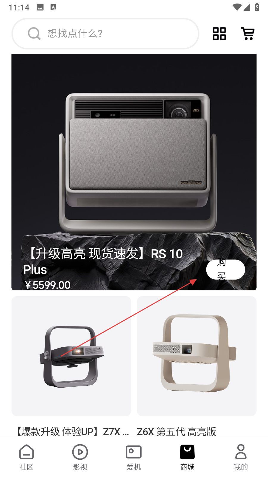 1、打開極米APP,點擊底部導(dǎo)航欄的商城,進(jìn)入商城頁面,選擇想要購買的商品,點擊商品上的購買按鈕。