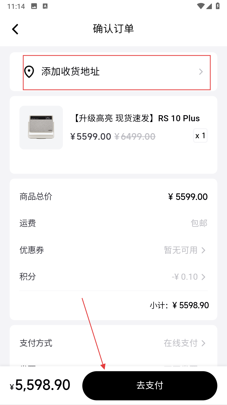 4、進(jìn)入確認(rèn)訂單頁面,添加收貨地址,選擇支付方式點擊去支付,完成付款。