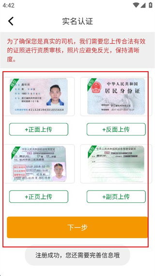 4、在實(shí)名認(rèn)證頁(yè)面上傳所需證照的正、反面等材料,點(diǎn)擊下一步完成操作。
