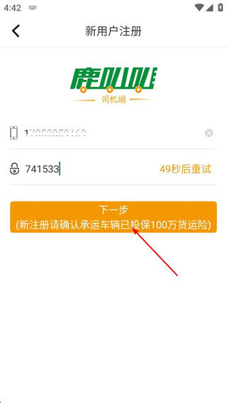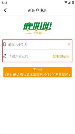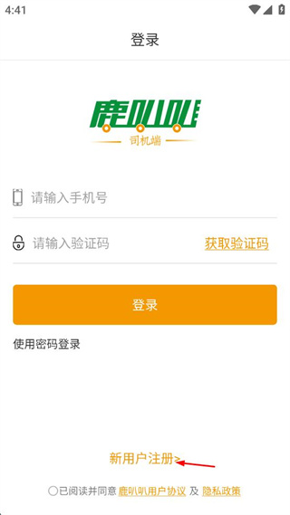 1、打開鹿叭叭司機(jī)端軟件進(jìn)入登錄頁(yè)面,點(diǎn)擊新用戶注冊(cè)選項(xiàng),跳轉(zhuǎn)至注冊(cè)界面。