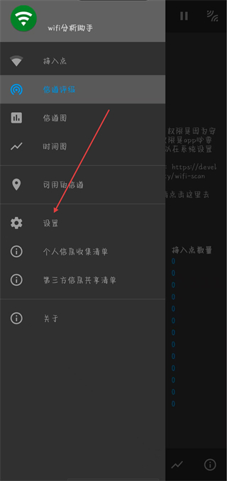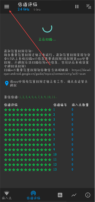 1、打開WiFi分析助手應(yīng)用,點(diǎn)擊左上角的三條橫線菜單圖標(biāo)。