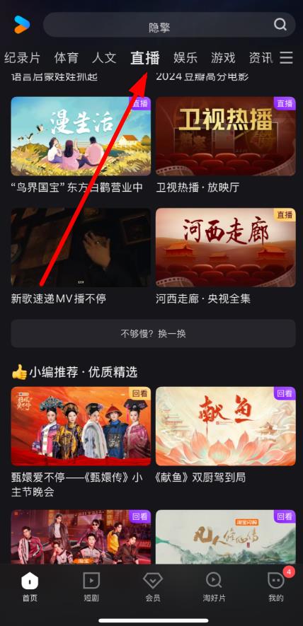 2、在首頁上方的分類欄中,找到并點擊直播選項。