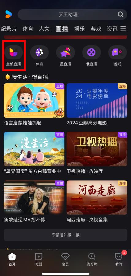 3、點擊后進入直播頁面,若想查看全部直播內(nèi)容,點擊全部直播,即可瀏覽并選擇觀看感興趣的直播節(jié)目。