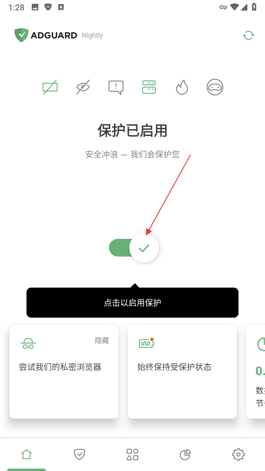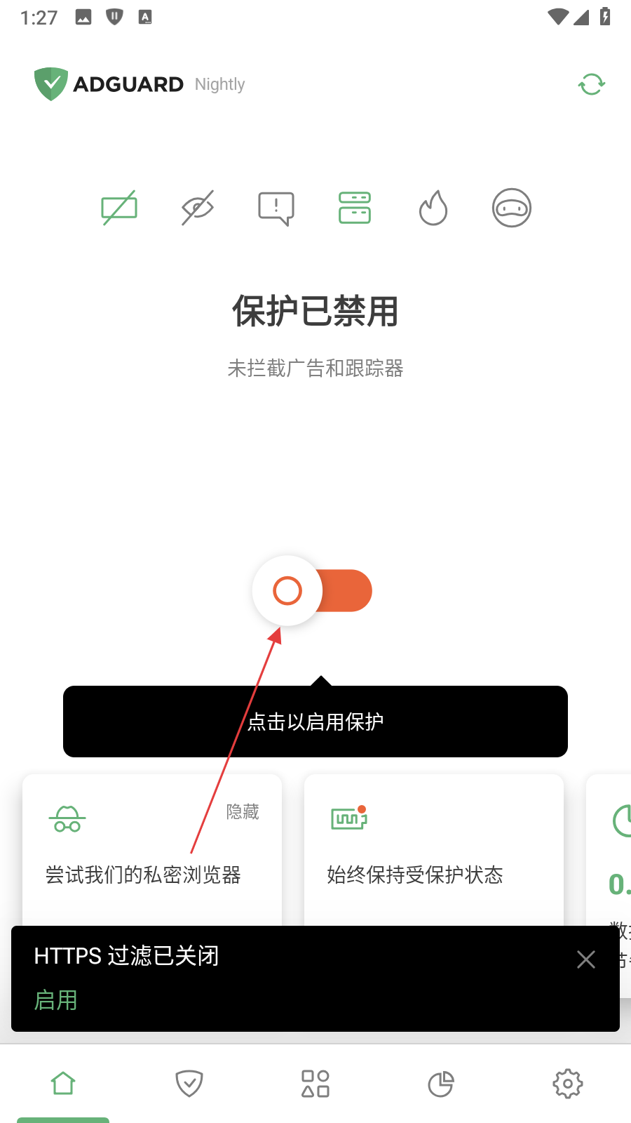 1、打開AdGuard應用,點擊界面中間的橙色開關按鈕啟用保護。