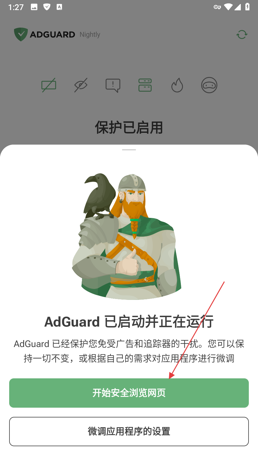 2、待界面顯示AdGuard已啟動并正在運行彈窗,點擊開始安全瀏覽網(wǎng)頁按鈕。