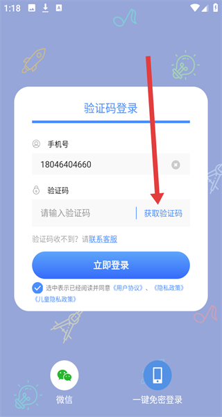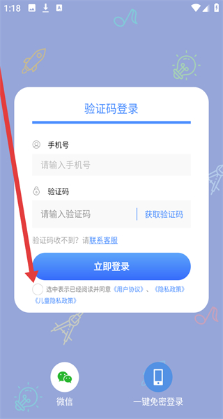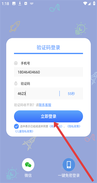 1、點擊同意按鈕,同意《用戶協(xié)議》《隱私政策》《兒童隱私政策》,進入登錄界面。