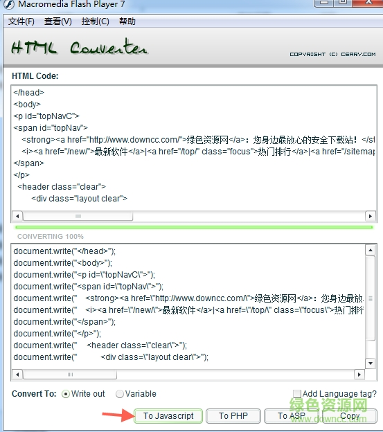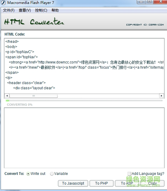 html轉js轉換器(HTML Converter)是一款非常好用的編程工具,能一鍵將html文件轉換為javascript文件,方便快捷,不懂JS代碼都能用,還支持轉換php和ASP,軟件綠色無毒,無需安裝就能放心使用,喜歡的朋友可以來綠色資源網下載!