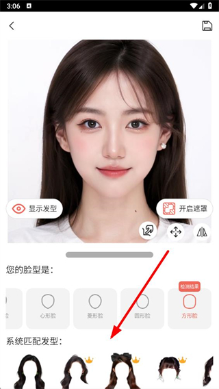 3、成功上傳照片后,軟件會自動檢測臉型,點擊選擇滿意的發(fā)型。