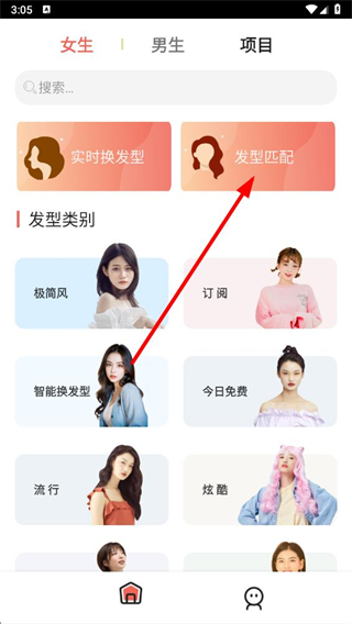 1、打開全棧發(fā)型設計軟件,在首頁點擊發(fā)型匹配功能選項,準備進行發(fā)型匹配操作。