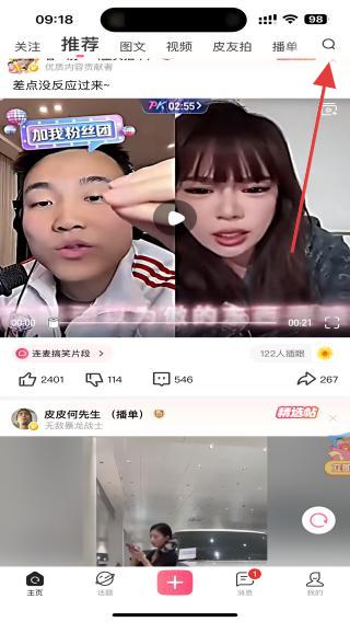 1、啟動(dòng)皮皮搞笑APP,在首頁(yè)的右上角點(diǎn)擊搜索的圖標(biāo)。