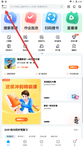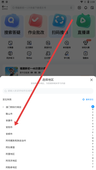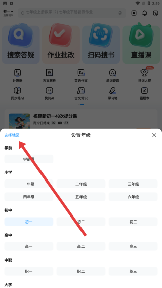 1、在進入到作業(yè)幫的首頁中后,可以點擊箭頭指向左上角區(qū)域,進行地區(qū)的選擇。