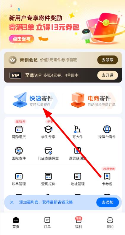 1、需要打開(kāi)掌中通應(yīng)用進(jìn)入首頁(yè),點(diǎn)擊快速寄件選項(xiàng),進(jìn)入寄件操作界面。