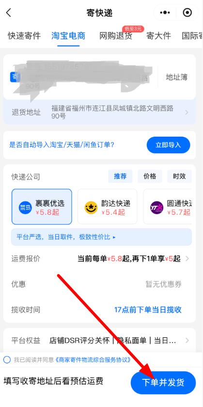3、填寫收件人地址、選擇快遞公司,還可查看運(yùn)費(fèi)報(bào)價(jià)等信息,確認(rèn)無(wú)誤后勾選協(xié)議,點(diǎn)擊下單并發(fā)貨,等待快遞員上門取件。